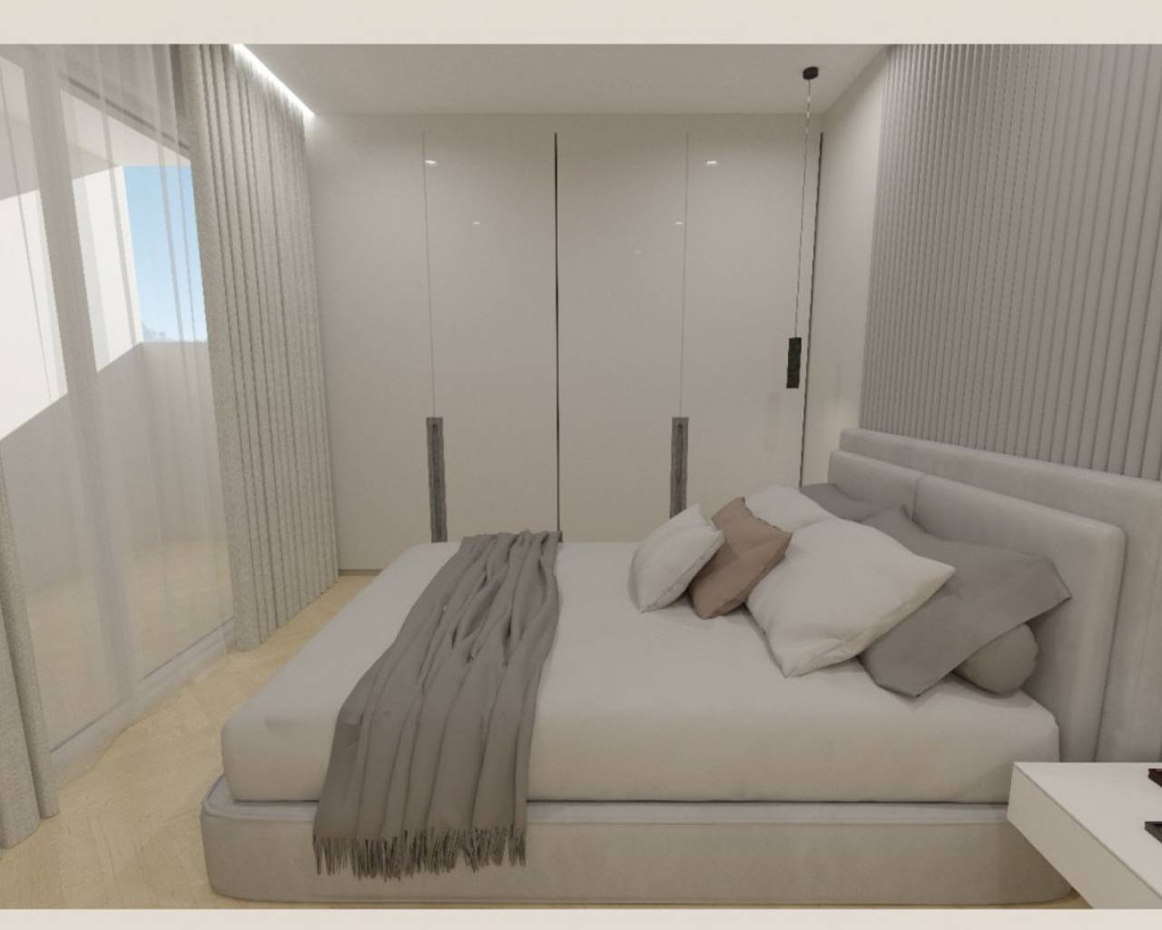 Dit moderne nieuwbouw project bestaat uit slechts 9 appartementen en wordt momenteel gebouwd op een toplocatie voor wie graag op wandelafstand van alle voorzieningen woont. Het gebouw ligt aan de rand van het historische centrum van Jávea en op slechts 1 km van het strand en de haven. Er zijn nog 6 appartementen beschikbaar: drie appartementen met een privétuin en drie appartementen op de eerste verdieping. Alle appartementen beschikken over een hal, een ruime woon-eetkamer met open keuken en kookeiland, een bijkeuken/wasruimte, drie tweepersoonsslaapkamers en twee badkamers. De appartementen op de eerste verdieping hebben bovendien drie tot vier terrassen. Het complex biedt ook een gemeenschappelijk zwembad en optioneel kan een parkeerplaats in de ondergrondse garage worden aangekocht voor € 12.000 en een berging voor € 5.000. De oplevering is voorzien voor de zomer van 2026 (onder voorbehoud).