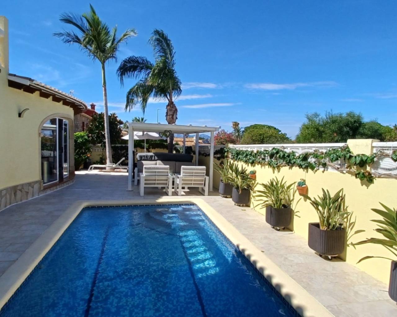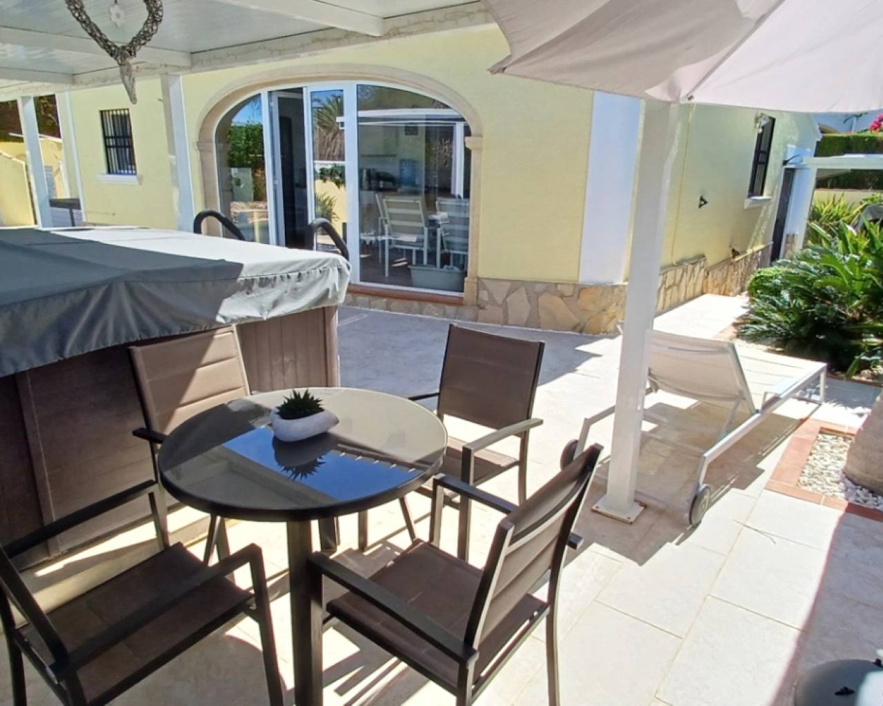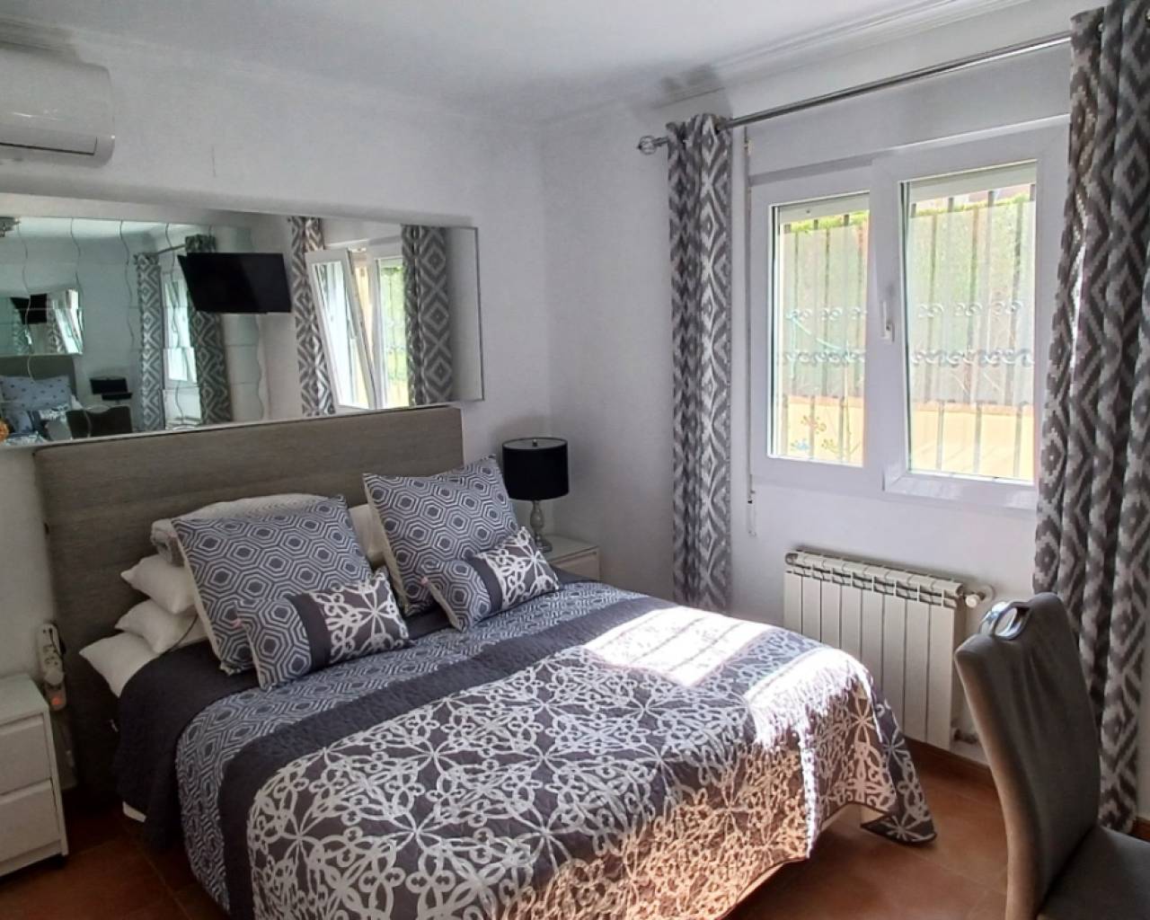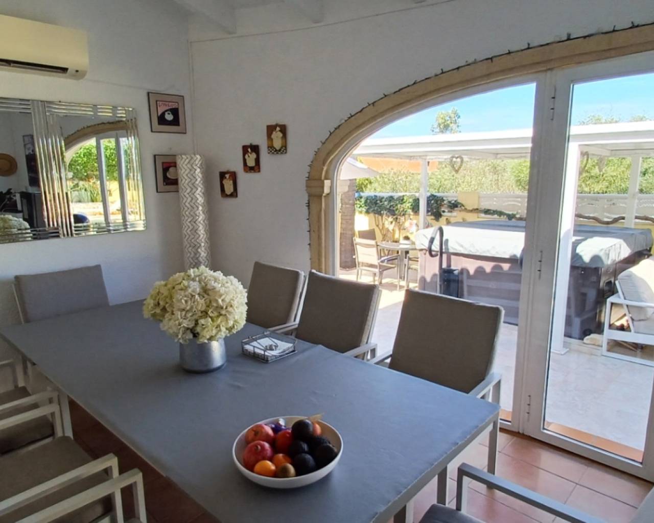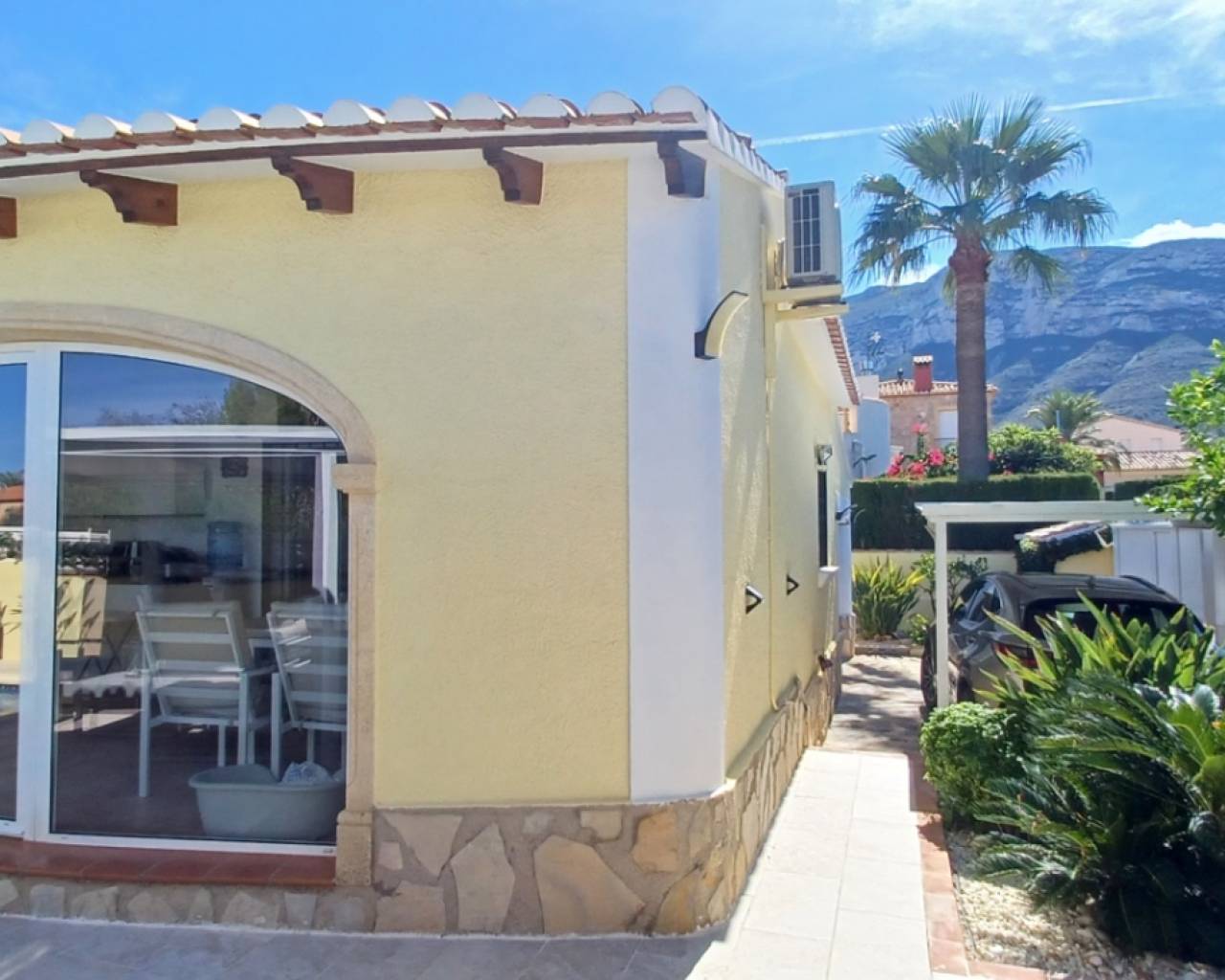 Charmante villa met zwembad en uitzicht op het Montgó-gebergte, gebouwd in 2002 op een vlakperceel op wandelafstand van het centrum van Denia en alle voorzieningen. Het huis beschikt over een compleet zonnesysteem voor elektriciteit en warm water. Er is airconditioning (warm en koud), dubbele beglazing en centrale verwarming op gas in de hele villa. Er is ook een verwarmd zwembad voor het hele jaar door, evenals een jacuzzi, overdekte en open terrassen, een zonneterras, een barbecueplek en een buitendouche. Op de begane grond bestaat het huis uit een grote woonkamer die leidt naar een overdekte serre/eetkamer met naya, een aparte, volledig uitgeruste keuken, twee tweepersoonsslaapkamers met inbouwkasten en een badkamer met douche. Boven bevindt zich de master suite met een badkamer met douche, een woonkamer en een groot terras met een prachtig open uitzicht. Er is ook een garage en carport, en een prachtige, onderhoudsvriendelijke tuin met sinaasappel-, citroen- en mangobomen en bloeiende struiken.