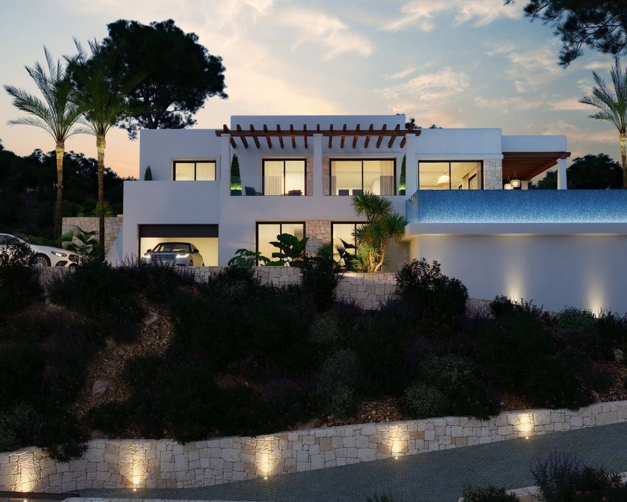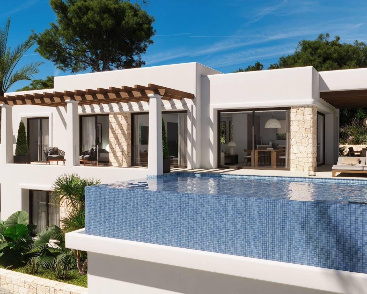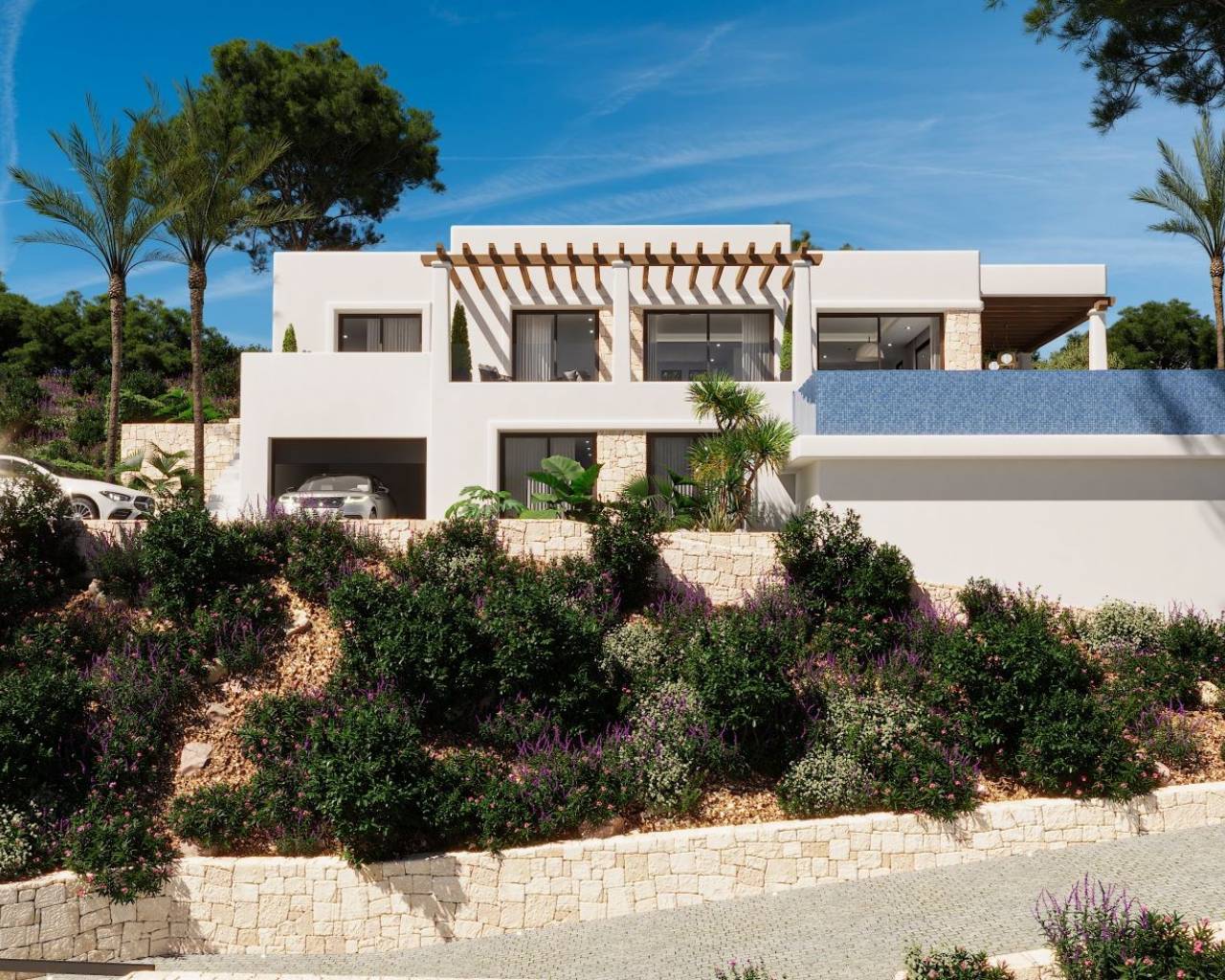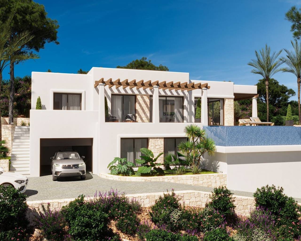 Moderne Villa naast Ifach Golf Club – Benissa Toplocatie Deze prachtige villa, gelegen in de rustige omgeving van de Ifach Golf Club in Benissa, biedt direct uitzicht op de golfbaan. Gelegen in een exclusieve woonwijk, combineert deze woning een luxueus ontwerp met een strategische locatie voor golfliefhebbers en wie op zoek is naar rust. Indeling en woonruimtes De woning is verdeeld over twee ruime verdiepingen met veel natuurlijk licht en een vloeiende indeling: Begane grond: Twee lichte slaapkamers, een complete badkamer, wasruimte en een ruime garage met plaats voor meerdere voertuigen. Bovenverdieping: Twee extra slaapkamers, waarvan één met en-suite badkamer, plus een gastentoilet en een moderne open keuken die verbonden is met een ruime woon-eetkamer met toegang tot het terras. Buitenleven De buitenruimte beschikt over een overdekt terras met pergola en een infinity pool die uitnodigt om te ontspannen en te genieten van het mediterrane klimaat. De groene omgeving zorgt voor privacy en een nauwe band met de natuur. Ontwerp en stijl Met zijn moderne architectuur, strakke lijnen en natuurlijke steendetails, past deze villa harmonieus in haar omgeving. De nabijheid van de golfbaan en het exclusieve ontwerp maken het de ideale keuze voor wie elegantie, comfort en een mediterrane levensstijl zoekt. Een luxe villa met uitzicht op de golfbaan en een modern design in een van de meest gewilde gebieden van Benissa – het perfecte evenwicht tussen rust, verfijning en natuur.
