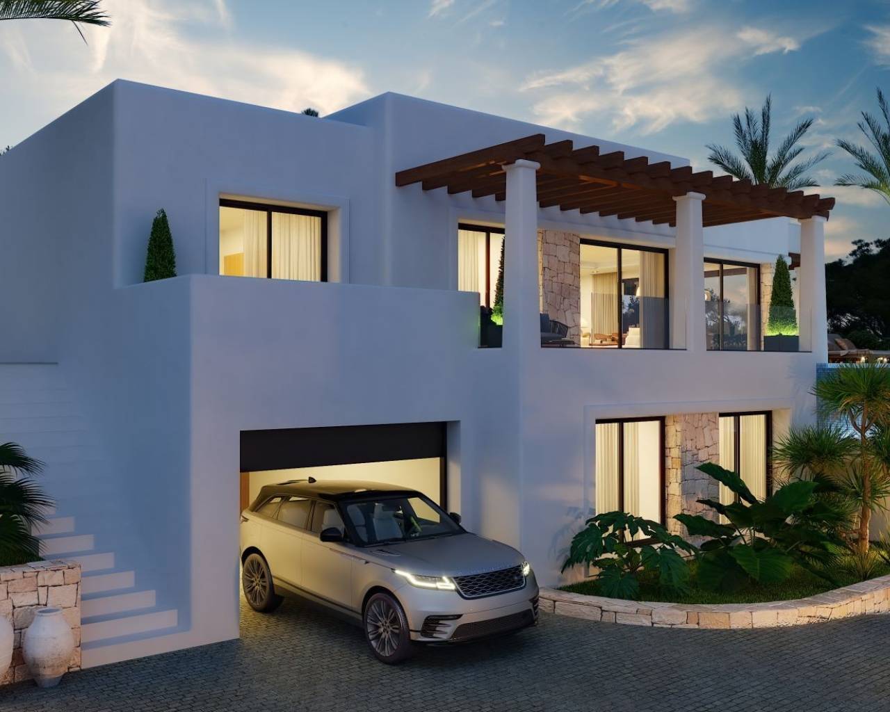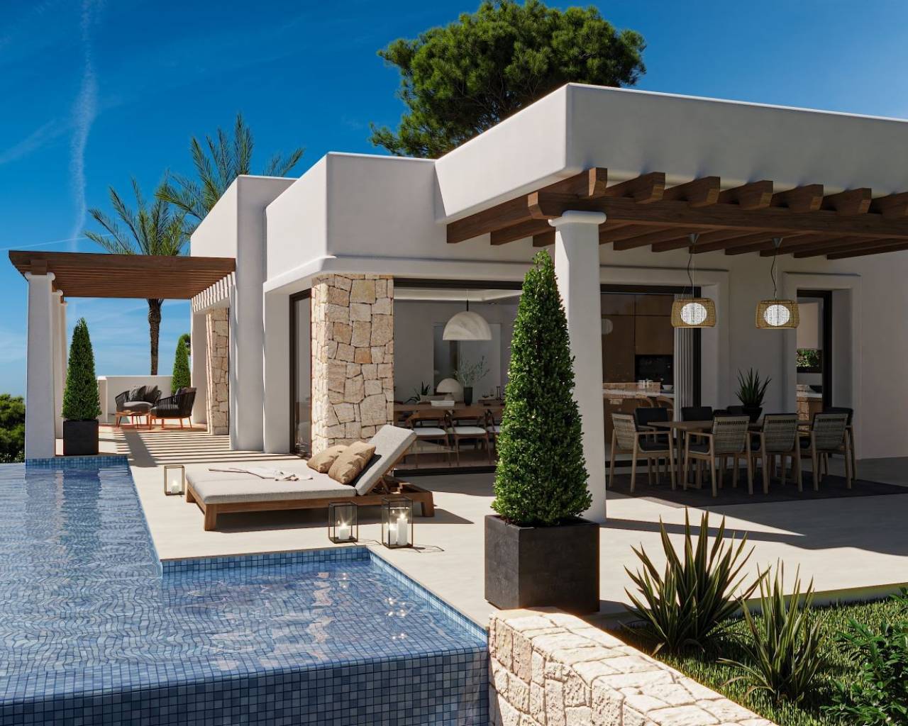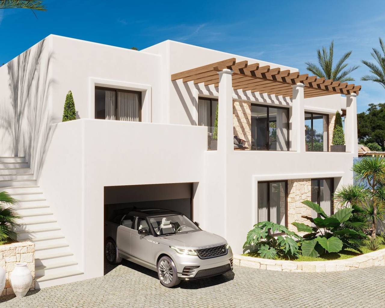 Moderne Villa naast Ifach Golf Club – Benissa Toplocatie Deze prachtige villa, gelegen in de rustige omgeving van de Ifach Golf Club in Benissa, biedt direct uitzicht op de golfbaan. Gelegen in een exclusieve woonwijk, combineert deze woning een luxueus ontwerp met een strategische locatie voor golfliefhebbers en wie op zoek is naar rust. Indeling en woonruimtes De woning is verdeeld over twee ruime verdiepingen met veel natuurlijk licht en een vloeiende indeling: Begane grond: Twee lichte slaapkamers, een complete badkamer, wasruimte en een ruime garage met plaats voor meerdere voertuigen. Bovenverdieping: Twee extra slaapkamers, waarvan één met en-suite badkamer, plus een gastentoilet en een moderne open keuken die verbonden is met een ruime woon-eetkamer met toegang tot het terras. Buitenleven De buitenruimte beschikt over een overdekt terras met pergola en een infinity pool die uitnodigt om te ontspannen en te genieten van het mediterrane klimaat. De groene omgeving zorgt voor privacy en een nauwe band met de natuur. Ontwerp en stijl Met zijn moderne architectuur, strakke lijnen en natuurlijke steendetails, past deze villa harmonieus in haar omgeving. De nabijheid van de golfbaan en het exclusieve ontwerp maken het de ideale keuze voor wie elegantie, comfort en een mediterrane levensstijl zoekt. Een luxe villa met uitzicht op de golfbaan en een modern design in een van de meest gewilde gebieden van Benissa – het perfecte evenwicht tussen rust, verfijning en natuur.
