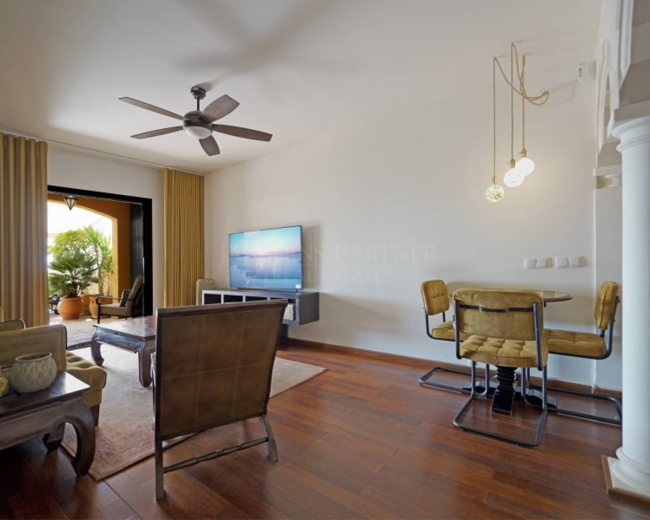 Appartement op de begane grond met ruime tuin en directe toegang tot de boulevard nabij het strand en de haven van Campomanes Dit 83 m² grote appartement op de begane grond beschikt over een ruim tuinterras met directe toegang tot de boulevard, op slechts een steenworp afstand van het strand en de haven van Campomanes. Ontworpen in een elegante Arabische stijl met hoogwaardige afwerkingen, biedt het een unieke en gastvrije sfeer in een locatie die exclusiviteit, privacy en rust combineert met gemakkelijke toegang tot essentiële voorzieningen, recreatie en eetgelegenheden. Het appartement beschikt over twee slaapkamers, twee badkamers, een woon-eetkamer, een keuken en twee ingangen, waarbij elk detail zorgvuldig is overwogen om een harmonieuze en comfortabele leefruimte te creëren. Gelegen in een omheinde gemeenschap, kunnen bewoners genieten van conciërgediensten, ruime groene zones, drie gemeenschappelijke zwembaden, twee padelbanen, een fitnessruimte en gemakkelijke toegang tot Mascarat Cove en de haven van Campomanes. Het appartement ligt in een prachtige natuurlijke omgeving, zeer dicht bij de zee, in een veilige en rustige wijk, met Altea en Calpe op slechts 10 minuten en het commerciële gebied van de haven van Campomanes dichtbij. Het Mascarat-gebied, met Marina Greenwich, is een spectaculair stukje land, slechts 3 km van het pittoreske stadje Altea en op enkele minuten van de Don Cayo Golfbaan en Villa Gadea Resort. Marina Greenwich ligt op de 000º 00' 00' meridiaan, de enige haven ter wereld op deze unieke locatie. De omgeving wordt omringd door prachtige stranden, baaien en zachte heuvels en biedt een perfecte mix van zee en natuur. #ref:1765