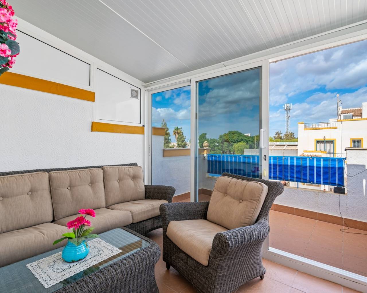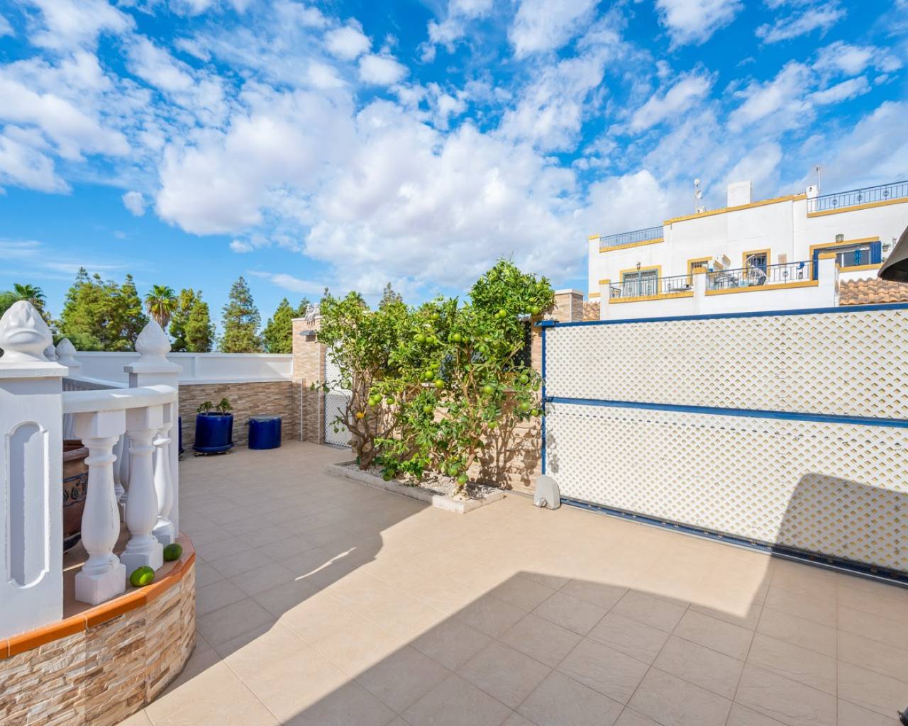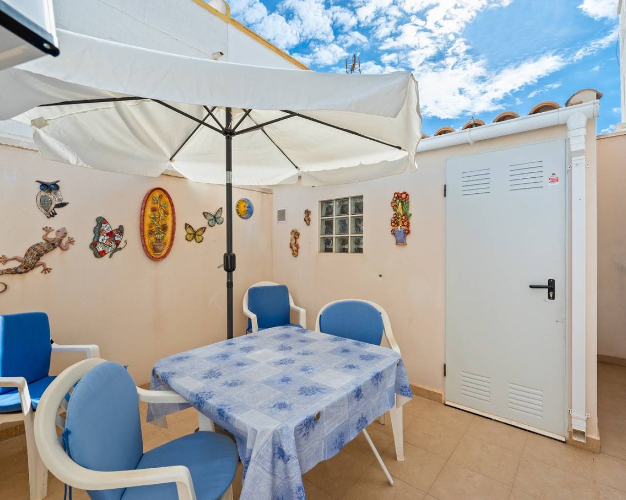 In de rustige urbanisatie Jardin del Mar, verscholen in een doodlopend straatje, vind je deze charmante quadwoning – een plek waar comfort en gezelligheid samenkomen. Het perceel is volledig afgesloten met een elektrische poort en beschikt over een overdekte parkeerplaats, een groot terras vooraan en aan de zijkant van de woning. Voor het huis staan een appelsien- en citroenboom, die voor een vleugje mediterrane sfeer zorgen. Bij het binnenkomen word je verwelkomd in een aangename leefruimte met aansluitende keuken. Alle ramen op de begane grond werden recent vervangen en zijn voorzien van dubbel glas. Op dit niveau vind je ook een slaapkamer en een badkamer met douche, toilet en vloerverwarming. Aan de voorzijde van de woning ligt een heerlijke veranda waar je het hele jaar door kan genieten: in de zomer zet je alles open voor een frisse bries, in de winter sluit je de ramen en creëer je een zonnige winterkamer. Aan de zijkant van de woning bevindt zich een ruime berging, ideaal als extra opslag. Op de eerste verdieping vind je een grote slaapkamer met schuiframen aan de voorkant. Het terras is hier dichtgemaakt en ingericht als een sfeervolle bureauruimte en loungehoek, waar je heerlijk kan genieten van het uitzicht. Verder is er nog een slaapkamer en een tweede badkamer met douche en toilet. Een trap leidt naar het solarium, waar je in alle privacy kan genieten van de zon. Hier bevindt zich ook de zonneboiler die de woning van warm water voorziet. Deze woning is praktisch, goed onderhouden en straalt warmte en gezelligheid uit. Met zijn zonnige terrassen, knusse veranda en fijne uitzichten is dit de ideale vakantiewoning of permanente thuis aan de Costa Blanca.