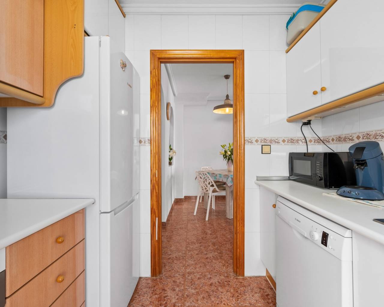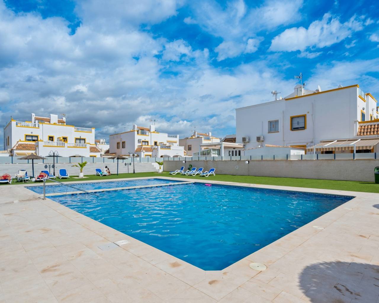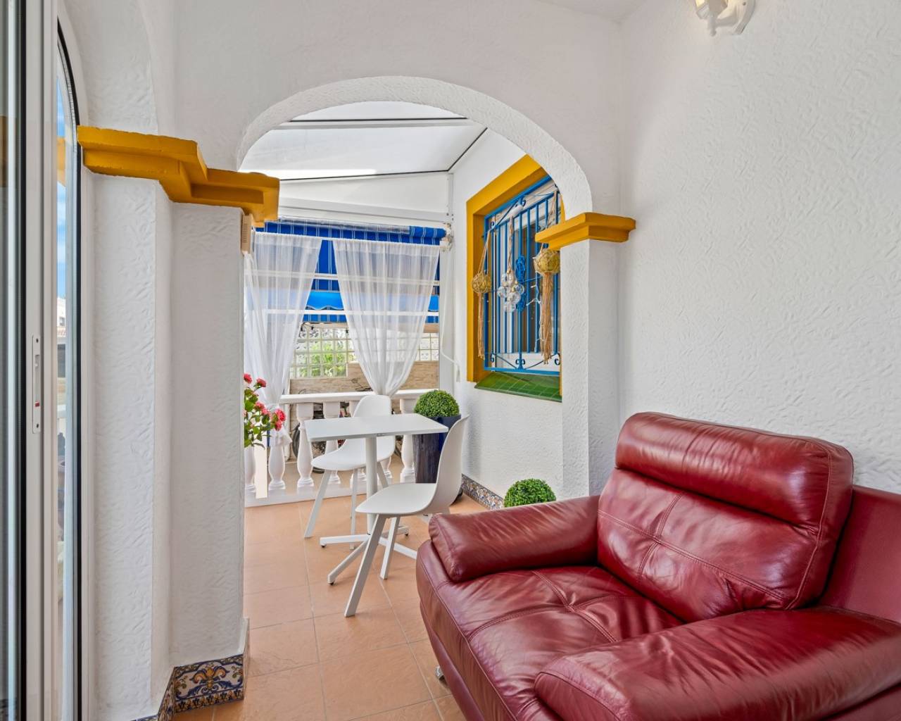 In de rustige urbanisatie Jardin del Mar, verscholen in een doodlopend straatje, vind je deze charmante quadwoning – een plek waar comfort en gezelligheid samenkomen. Het perceel is volledig afgesloten met een elektrische poort en beschikt over een overdekte parkeerplaats, een groot terras vooraan en aan de zijkant van de woning. Voor het huis staan een appelsien- en citroenboom, die voor een vleugje mediterrane sfeer zorgen. Bij het binnenkomen word je verwelkomd in een aangename leefruimte met aansluitende keuken. Alle ramen op de begane grond werden recent vervangen en zijn voorzien van dubbel glas. Op dit niveau vind je ook een slaapkamer en een badkamer met douche, toilet en vloerverwarming. Aan de voorzijde van de woning ligt een heerlijke veranda waar je het hele jaar door kan genieten: in de zomer zet je alles open voor een frisse bries, in de winter sluit je de ramen en creëer je een zonnige winterkamer. Aan de zijkant van de woning bevindt zich een ruime berging, ideaal als extra opslag. Op de eerste verdieping vind je een grote slaapkamer met schuiframen aan de voorkant. Het terras is hier dichtgemaakt en ingericht als een sfeervolle bureauruimte en loungehoek, waar je heerlijk kan genieten van het uitzicht. Verder is er nog een slaapkamer en een tweede badkamer met douche en toilet. Een trap leidt naar het solarium, waar je in alle privacy kan genieten van de zon. Hier bevindt zich ook de zonneboiler die de woning van warm water voorziet. Deze woning is praktisch, goed onderhouden en straalt warmte en gezelligheid uit. Met zijn zonnige terrassen, knusse veranda en fijne uitzichten is dit de ideale vakantiewoning of permanente thuis aan de Costa Blanca.