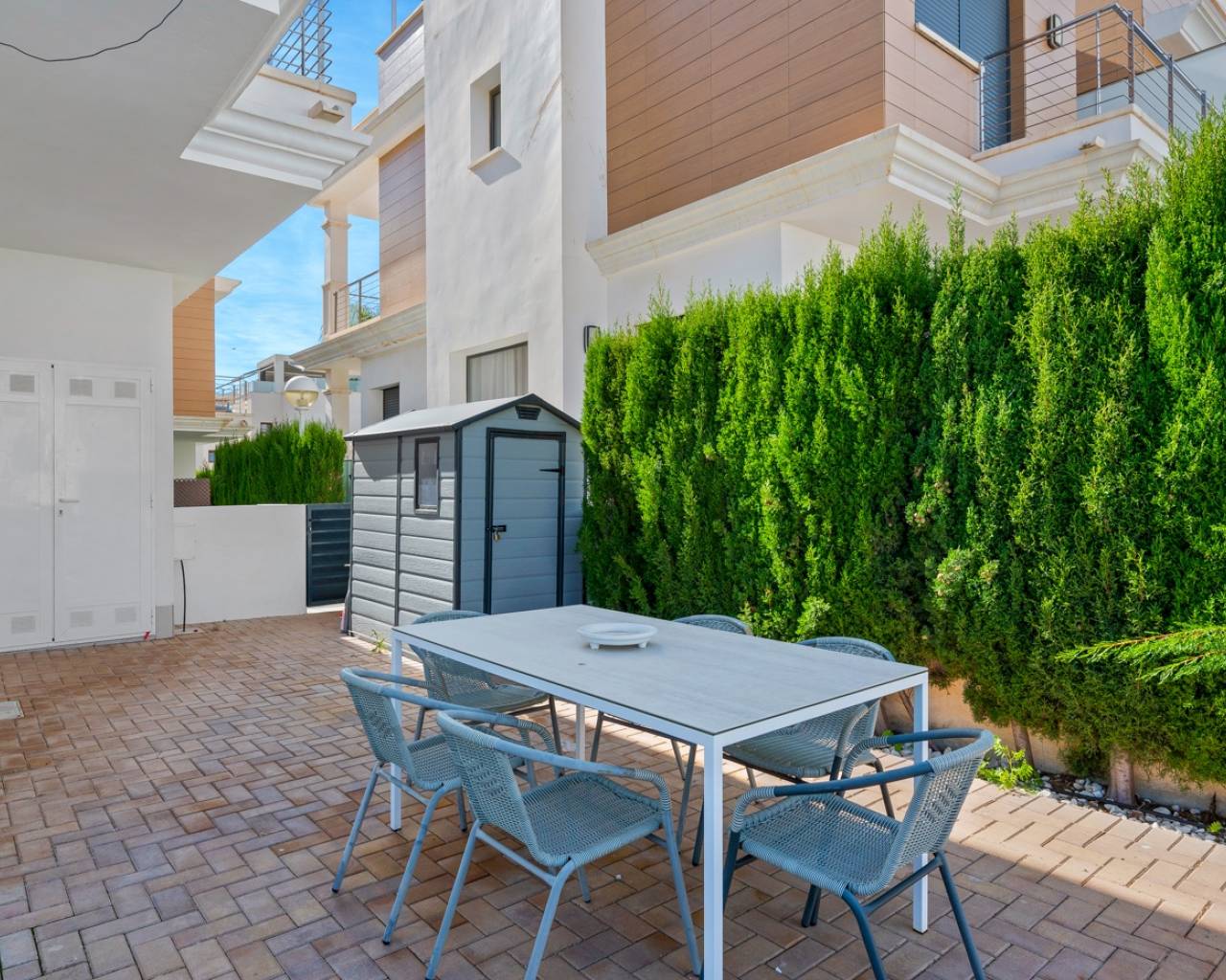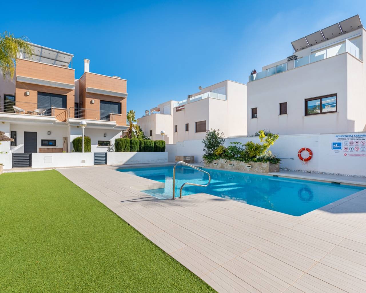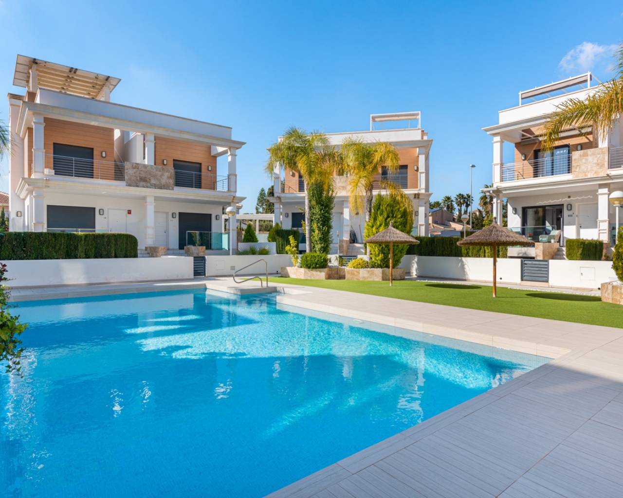 Deze charmante twee-onder-een-kapwoning ligt in een prestigieuze wijk van Ciudad Quesada, in een rustige, afgesloten gemeenschap die de bewoners toegang biedt tot een prachtig gemeenschappelijk zwembad en verzorgde groene ontspanningsruimtes. Het is de ideale keuze voor wie dagelijks comfort wil combineren met de mediterrane levensstijl en het vakantiegevoel het hele jaar door. Het interieur is ontworpen met oog voor functionaliteit en comfort. Op de begane grond bevindt zich een ruime, lichte woonkamer met een moderne open keuken. Vanuit zowel de woonkamer als de keuken is er directe toegang tot de privé-tuin – de perfecte plek om te genieten van een ontbijt in de ochtendzon of een diner bij zonsondergang in een ontspannen, mediterrane sfeer. Op deze verdieping bevinden zich ook een gastentoilet en een praktische bijkeuken. Het lichte souterrain biedt een extra slaapkamer met een eigen badkamer en een recreatieruimte die gebruikt kan worden als fitnessruimte, gastenverblijf of ontspanningsruimte. Op de eerste verdieping bevinden zich twee comfortabele slaapkamers met ingebouwde kasten en een stijlvolle badkamer. Elke slaapkamer heeft directe toegang tot een eigen privébalkon, waar je kunt genieten van het uitzicht op het groen en het natuurlijke licht gedurende de dag. Op het dak bevindt zich een ruim solarium – een privé-oase van rust, perfect om te zonnebaden, te lezen of te genieten van de warme Spaanse avonden onder de sterren. De woning is omgeven door een goed onderhouden privé-tuin waar je volop kunt genieten van het mediterrane klimaat en meer dan 300 dagen zon per jaar. De locatie biedt gemakkelijke toegang tot supermarkten, restaurants, cafés en alle benodigde voorzieningen. Deze woning combineert comfort, stijl en rust op een perfecte manier – ideaal als permanente woning of als investering voor vakantieverhuur. Volledig gemeubileerd en instapklaar, nodigt ze je uit om een nieuw hoofdstuk van je leven te beginnen onder de warme Spaanse zon.