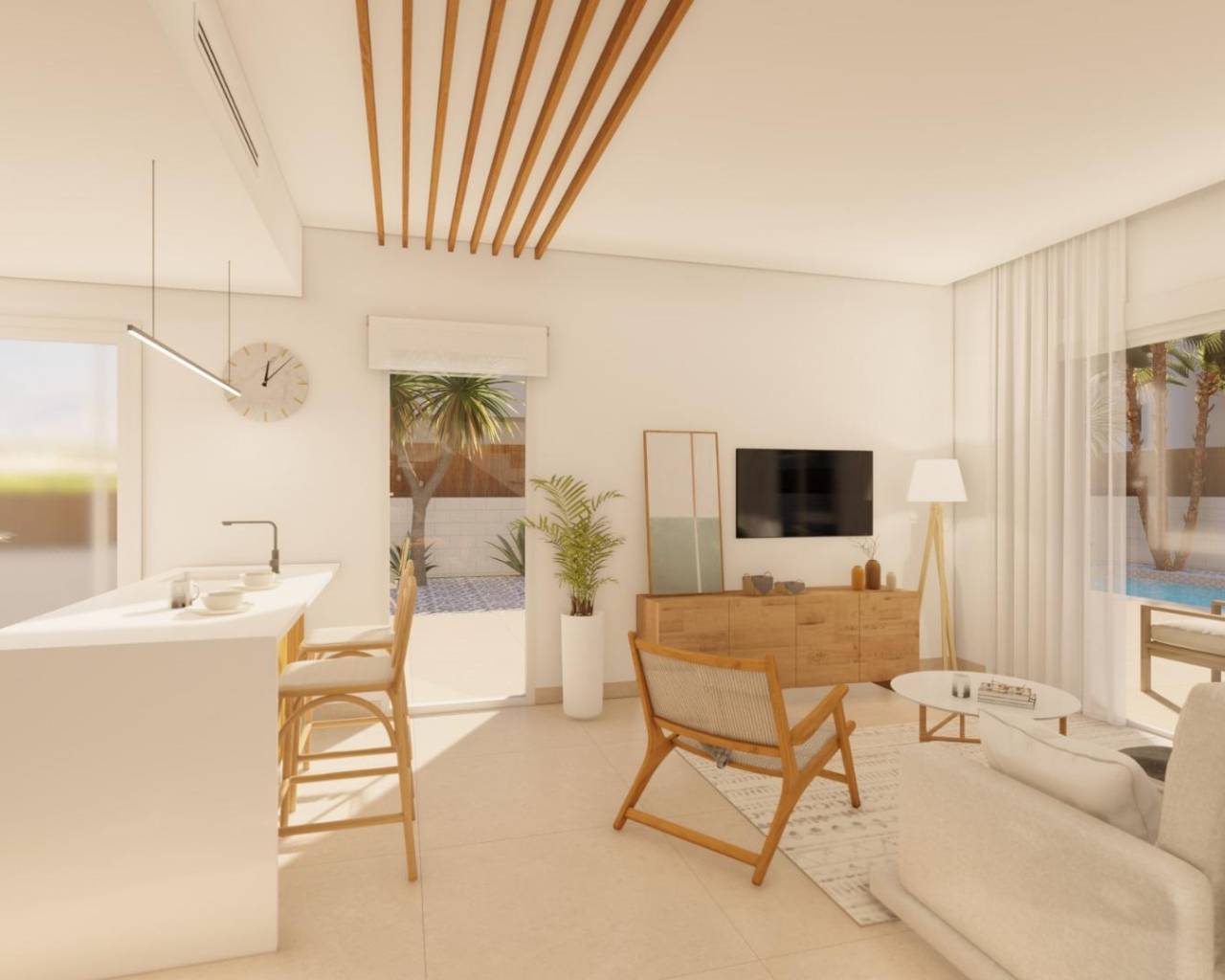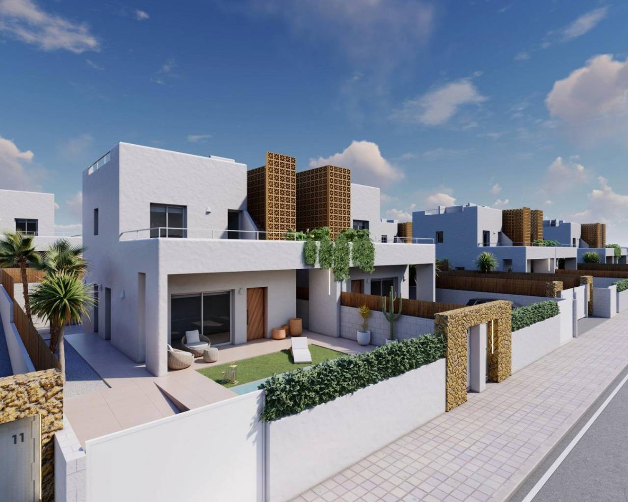 NIEUWBOUW VILLA'S IN PILAR DE LA HORADADA Nieuwbouw villa's in Pilar de la Horadada. Het interieur van de villa's bestaat uit 3 slaapkamers, 3 badkamers en suite, grote open woonkamer met keuken alles gelegen op twee verdiepingen. De buitenkant heeft een grote aangelegde tuin met privé zwembad en parkeerplaats. Nieuwbouw Villa's waar u de beste mediterrane stijl aangepast aan modern design zult vinden. Residentieel bestaat uit 17 villa's gelegen in Pilar de la Horadada, omgeven door alle diensten die u nodig heeft en op slechts enkele minuten van het strand. Pilar de la Horadada is een typisch Spaans dorp in het meest zuidelijke deel van de Costa Blanca. De grote hoofdstraat heeft supermarkten, veel winkels, restaurants en bars en enkele mooie pleinen. De prachtige stranden van Torre de la Horadada en Mil Palmeras met fijn zand en boulevard liggen op slechts 5 minuten afstand. In Pilar de la Horadada is er ook een goed ontwikkeld fiets- en wandelpadennetwerk, en er is ook een groot aanbod van diverse sportactiviteiten. De golfbaan Lo Romero met 18 holes ligt op korte rijafstand van de stad. De luchthavens van Corvera (Murcia) en Alicante liggen op respectievelijk 40 en 55 minuten afstand.